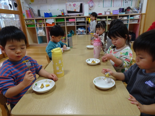 かぼちゃ、さつまいも、りんご、柿など秋の食べ物のシルエットクイズをしたり、断面図を見ながら色んな食べ物があることを学びました。シルエットクイズでは、すぐに正解出来たり、なんだろう?と考えながら答えていました🍎