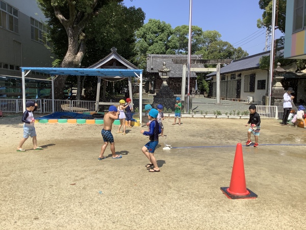 暑い日も、子どもたちは戸外遊びをしたりと元気いっぱいです♪プール・水遊びも始まりました。みんな楽しみに待っていたので、大はしゃぎです❤顔に水がかかってもへっちゃらな子もいます😊