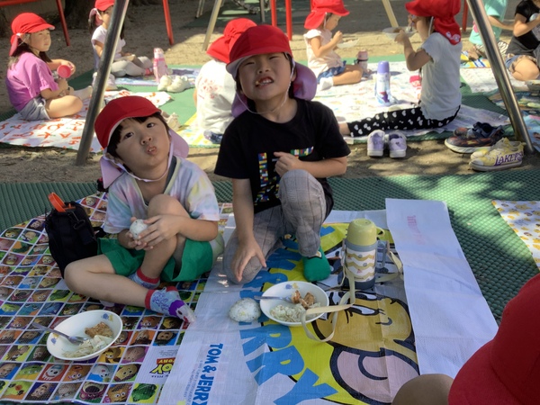 青空給食🌞では、近くの神社や園庭で楽しく給食🍙を楽しみました😊青空の下で食べる給食はすご〜く美味しかったね🎵