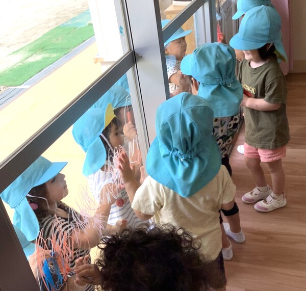 大きな窓に専用クレヨンでお絵描きをして遊びました🖍クレヨンの感触を楽しんだり、思い思いに表現する姿が見られました🌈