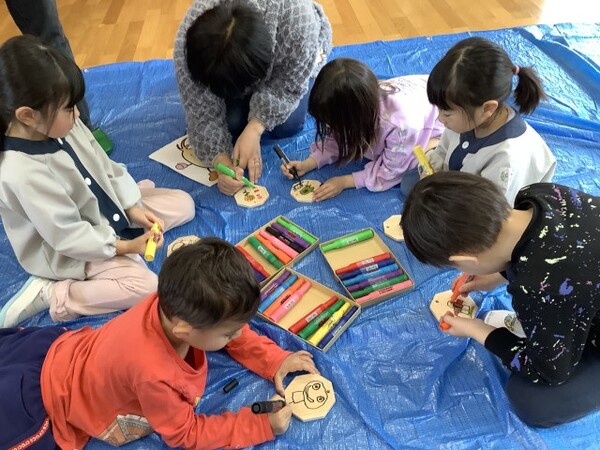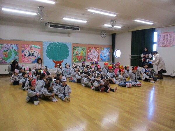 節分が近づいてくると「鬼来るかなぁ」「こわい💦」などの声もちらほらと聞かれるようになってきました。しかしその中で鬼を退治するためにどうしたらいいかと子どもたちも考えるようになり、アンパンマンになってやっつける、バクダンを作る!などと工夫して作ったものを身に付けて挑んでいました☺