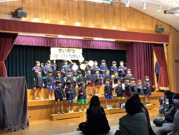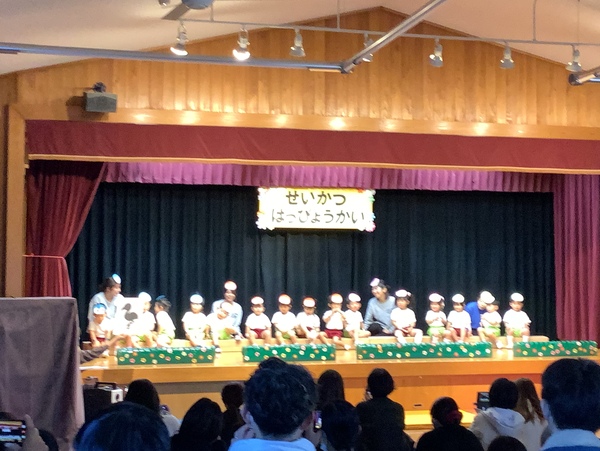 11月29日(土)に生活発表会が行われました。お家の人が見に来てくれることを楽しみにしていた子どもたち。たくさんのお客さんの前でドキドキしたけれど、頑張っている姿を見てもらうことができたね。また1つ素敵な思い出が増えました☆